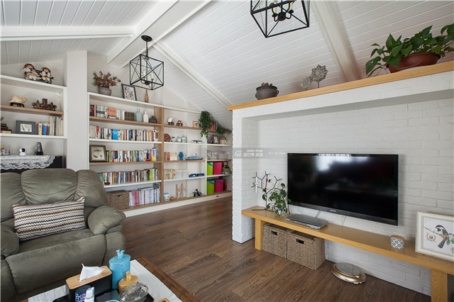 斜頂的設計營造美式鄉村的樸實、自然的氛圍。沒有濃墨重彩,但又淡雅的恰到好處。美式崇尚熱愛自由,電視背景墻張揚野性的設計,注重突出原始建材的質感,看似粗狂,實則和諧有個性。