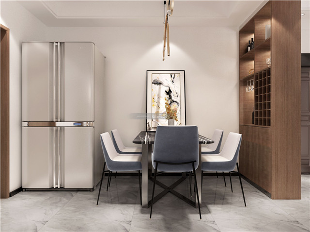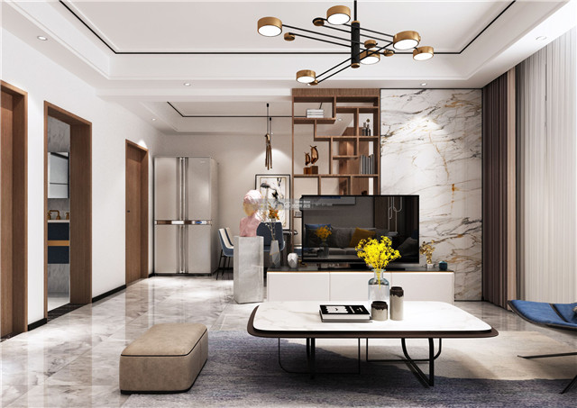 簡約雅逸的氣質,運用一些木質元素,讓家看起來更加溫馨和愜意。電視背景墻運用隔而不斷的屏風元素,實現中西文化的碰撞,讓層次更加豐富,空間也更通透。