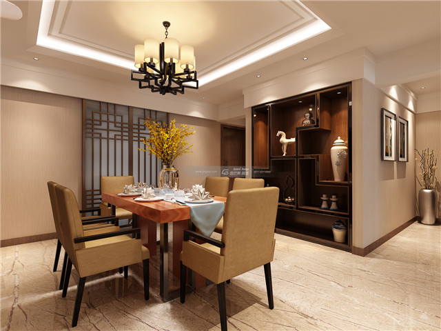 典雅的餐桌椅和柜體呈現(xiàn)貴氣的中式韻味,端雅的餐邊柜把中式的貴氣雅致進一步渲染,中式的燈飾和屏風,讓家居更加呈現(xiàn)中式的典雅韻味。