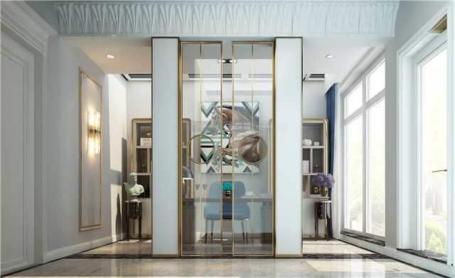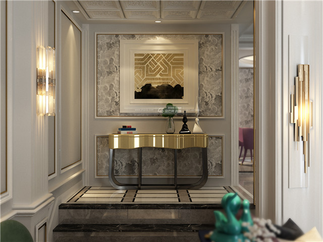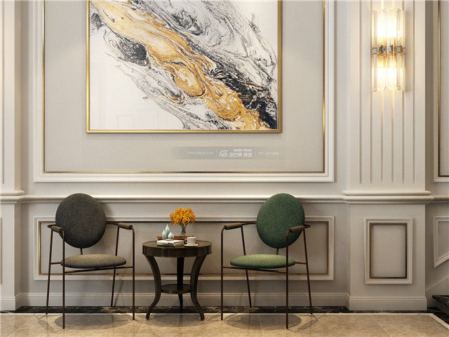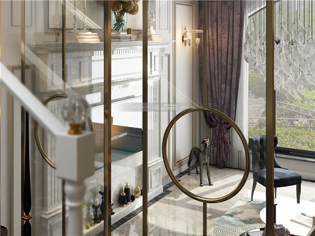 大量運用金屬元素,無論是金屬線條還是家具,亦或是精貴的燈飾和裝飾,都在為空間井然有序的貴氣貢獻著自己的力量,不是雜亂的堆積,而是有序的進行,最終成為一個融洽的、貴氣典雅的儀式感空間。 墻上雕刻的暗花和鑲金度邊的家具,渲染恰到好處的奢華。