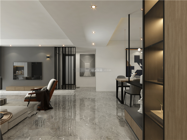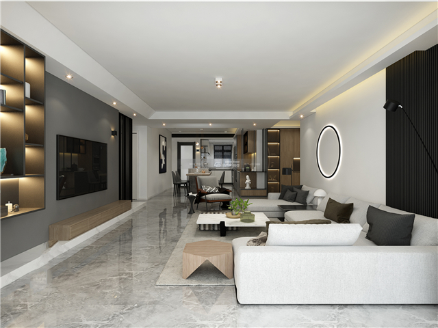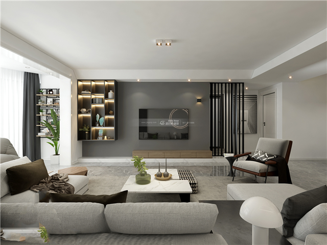 客廳吊頂無主燈,將需要照明的地方用小射燈代替,局部分散照明可以讓空間更有層次感。大面積白色和灰色,為空間渡上安穩(wěn)、沉靜的氛圍,氣質(zhì)感也很好地營造。