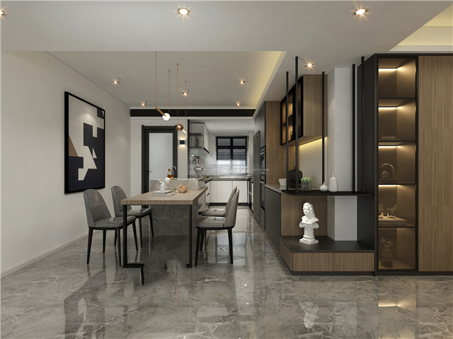 木材餐邊柜增加空間溫度,精簡的線條更添時尚氣息和精致感。灰色餐桌椅呼應空間,帶來簡約、高級的空間氣息。