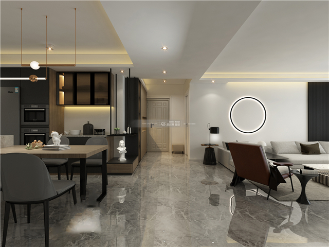 整個墻面空間都是大面積留白,局部搭配木質(zhì)元素和黑色不銹鋼,既溫暖又年輕時尚。圓形的燈飾為空間注入個性,讓沉穩(wěn)的空間變得個性、活潑。