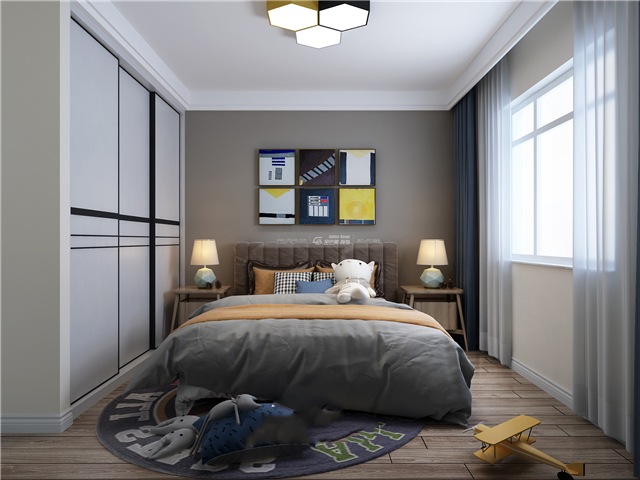 臥室風格延續(xù)客廳的現(xiàn)代極簡風,低調(diào)帶有輕奢感的配色,減少過多的包裝設(shè)計從而打造更加舒適簡潔的臥室環(huán)境。個性的衣柜增加空間通透性和個性。