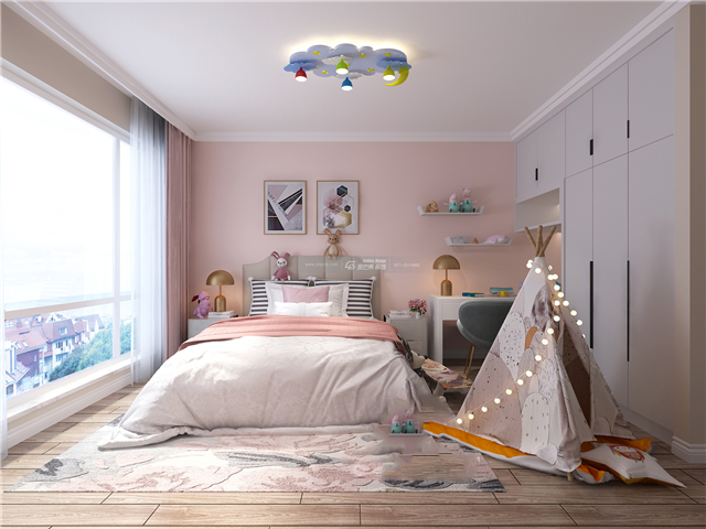 粉紅色、藝術(shù)掛畫和背景墻,切合小主人公的興趣愛好,以靈活童趣的軟裝營造輕松活躍的小空間。