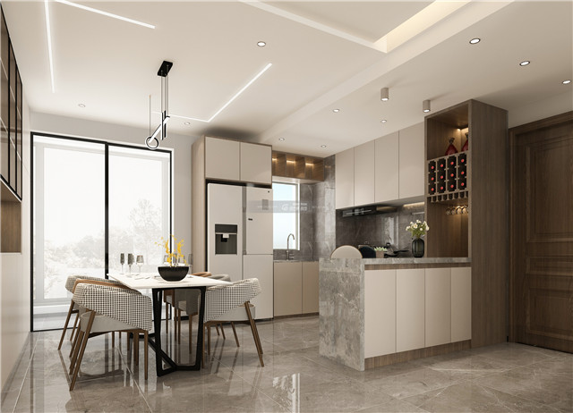 材質(zhì)不同的餐椅,打造出精致的品質(zhì)感和層次感。木材餐邊柜增加溫暖的感覺。