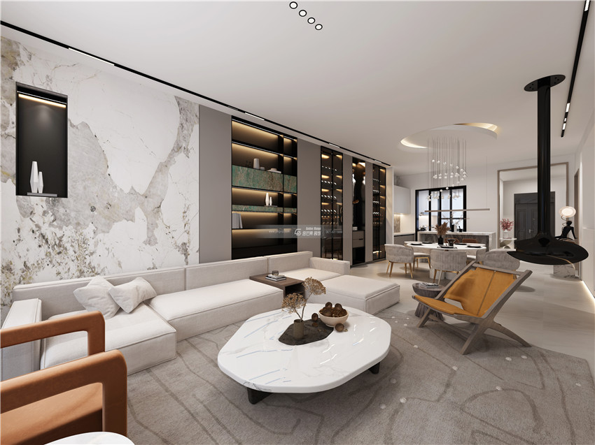 材料是現代的,形式是現代的,對功能布局的規劃與動線排布的思考也是現代的。光影材質和金屬線條讓時尚感蔓延,方正的白色沙發干凈利落讓空間更加簡潔。