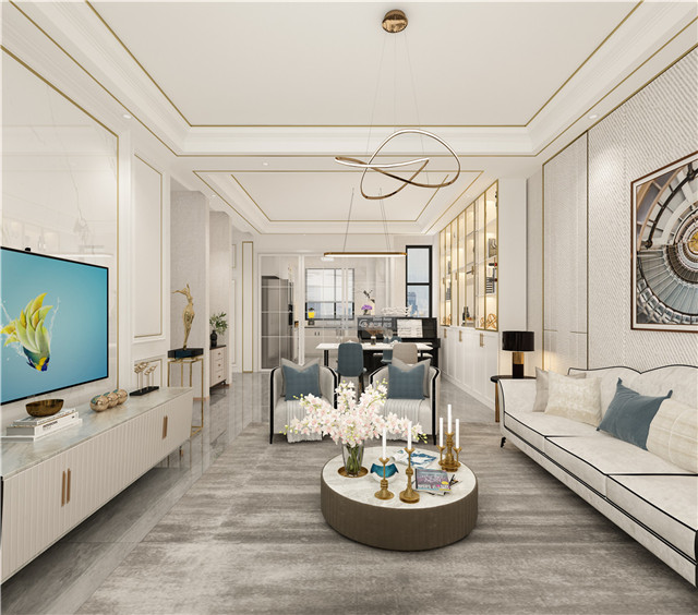 客廳給人的感覺非常時尚氣派但是又不會過度奢華,整體色調是以白灰為主再加入一些香檳色的線條設計,華麗之余不會讓人產生過多的疏離感,溫馨舒適。簡約精致的燈飾,注入個性精致的氣息。沙發和茶幾互相呼應,茶幾上再擺放一束鮮花,活躍氣氛又花香撲鼻。