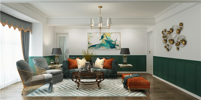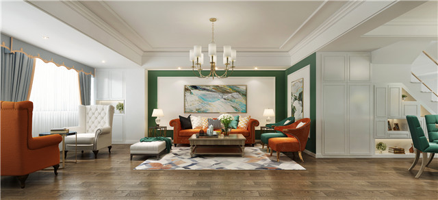 隨性慵懶的美式風格,明亮鮮艷的色彩彰顯自由不羈的家居態度,明麗的顏色熱情活潑。綠色和橙色的撞色讓家居充滿個性的色彩,溫厚的木地板和美式家具,讓家放松又自由,彰顯品質感。