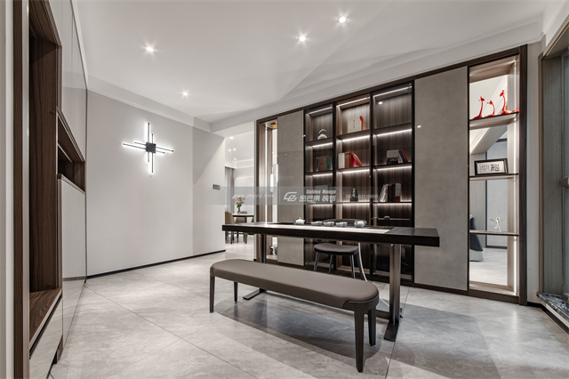 書房,原本戶型是一個不規(guī)則的地方,通過設計師的改造利用后變成了獨有的造型,柜子兩邊做了隔而不斷的展示柜既增強了書房的采光通風性能又增強了與客廳的通透性。