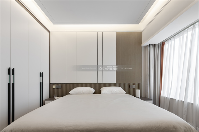 來到主臥室,同樣以簡約溫馨為主,頂面方形定設計加上石膏板線條,木質(zhì)格柵,臥室借助明亮的光線將空間詮釋得干凈細膩,毫無一絲繁雜。大面積留白的使用營造出寧靜舒適的休憩空間。