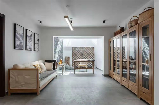 客廳地墻頂渾然一色,配上團圓寓意的燈飾,加上古色古香的家具,恰到好處的軟飾,廳中的掛畫也成了點睛之筆。