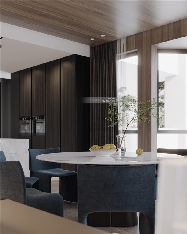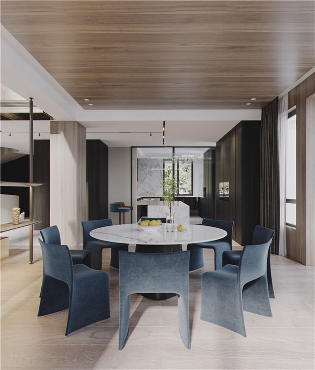 優(yōu)雅的墨藍色、絲絨窗簾,簡約的大理石臺面,木飾面增加品質和溫度感,大理石臺面打造的是利落的高級感。簡約利落、誠摯靜美,打造高級感的高品質家居格調。
