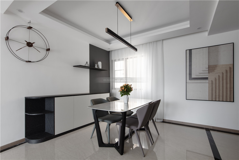本套昆明裝修現代風格案例采用現代風格經典色系黑白灰,白色墻體使空間看起來更加干凈通透,黑色小桌搭配灰色沙發加以淺灰色地磚,使整體空間更顯沉穩,搭配跳脫的裝飾畫,使空間更顯靈動。