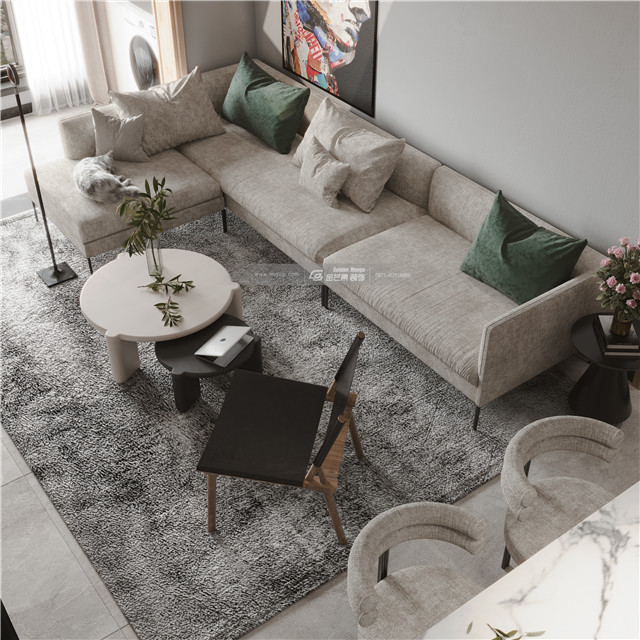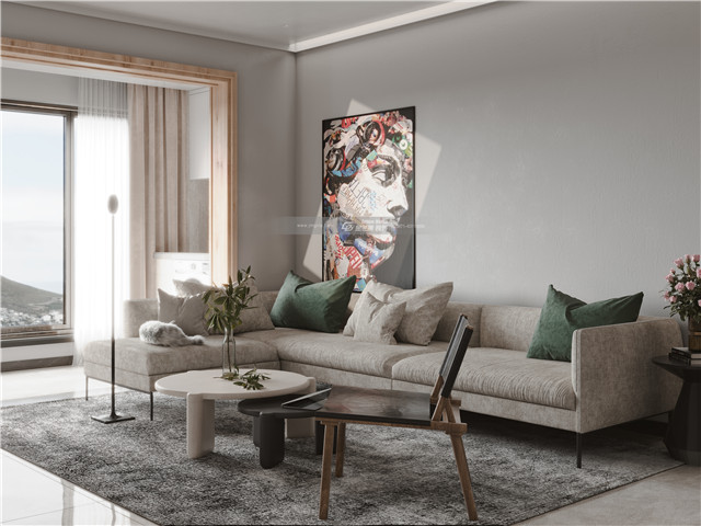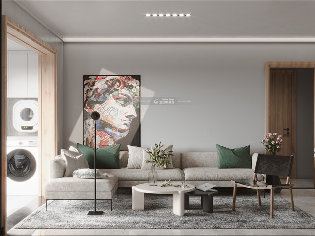 簡約的灰色,不同層次的鋪展開來,醞釀高級而豐富的層次。墻面的灰度讓空間變得富有高級感,灰色地毯承載溫厚的空間溫度感,棉麻的沙發(fā)讓空間變得更加文藝和細膩。
