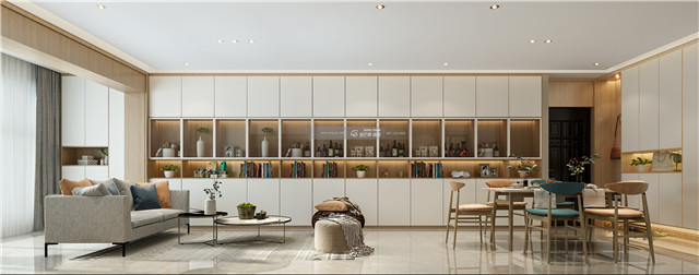開放的客餐廳設計,讓空間更顯靈動和肆意,空間互動性更強,讓房間更顯溫馨。電視背景墻設置成柜體增加收納,內嵌電視增加功能性,讓電視背景墻簡潔收納和美觀。