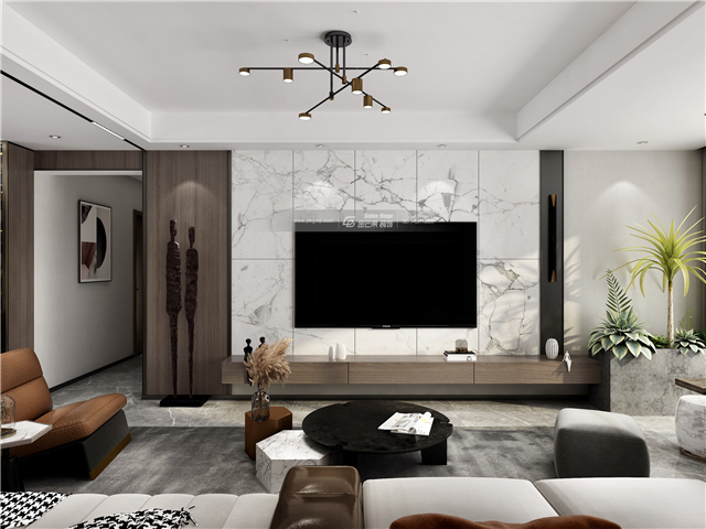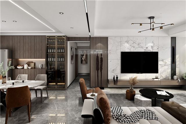 電視背景墻用大理石材增加空間高級感,石材花紋讓空間變得更加有意境和優雅。大量的木材的運用增加溫暖感,搭配金屬玻璃的酒柜,時尚感滿滿的同時,家的舒適度也彰然顯現。