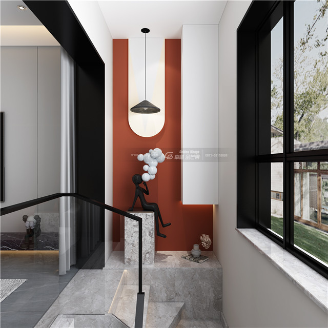 灰色電視背景墻搭配圓弧的造型,高冷中不乏溫柔的情調。清透的樓梯和玻璃和旁邊吧臺的情調形成鮮明的對比,展現冰與火的空間碰撞,空間變得多變起來。電視背景墻旁邊的亮色材質,讓空間變得亮眼了起來。