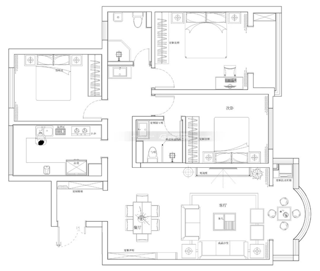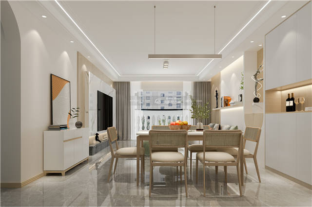 圓潤(rùn)的弧度讓家居變得溫柔可愛(ài),背景墻設(shè)置格柵和臺(tái)板,井然有序的敘述著簡(jiǎn)單的小美好。