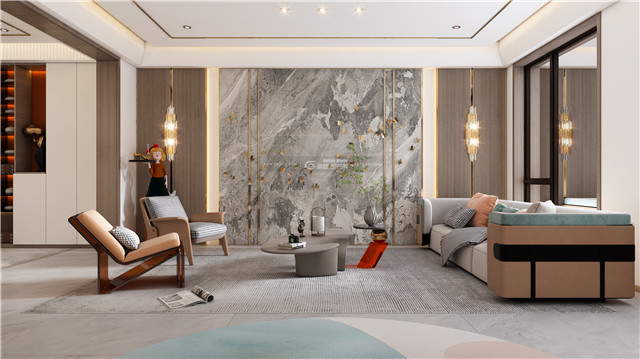 背景墻用大理石打底,加上一些金屬的線條和裝飾物,空間就變得具有輕奢氣息起來。兩邊華麗的燈飾折射出精致的光線,空間變得閃耀,暖橘色的單椅和點綴橘色、青色的沙發,讓空間多了一些溫馨的韻味,空間更加多變。