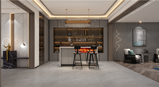 酒吧區運用金屬線條、灰玻,讓空間充滿格調感。典雅的柜子和吧臺結合,中西碰撞韻味盡顯。在吧臺上安裝電子壁爐,喝上幾杯清酒,身心都是暖暖的。