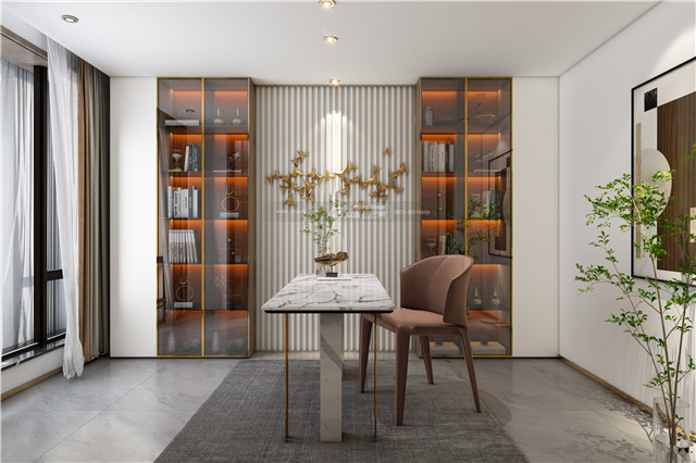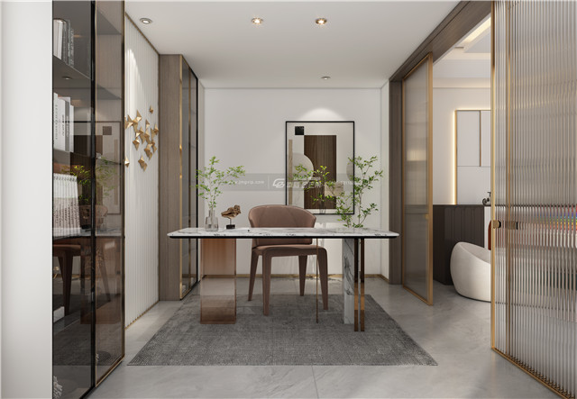 運用的是相對清新的顏色,簡潔的大理石書桌,灰粉色辦公椅,精細的線條,讓空間變得精致韻味十足?;也:烷L虹玻璃,營造隱約的光影效果,高級感滿溢。