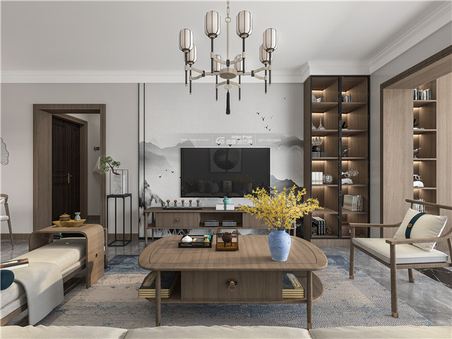 電視背景墻一幅水墨山水畫,將中式寫意的韻味很好地展現出來。