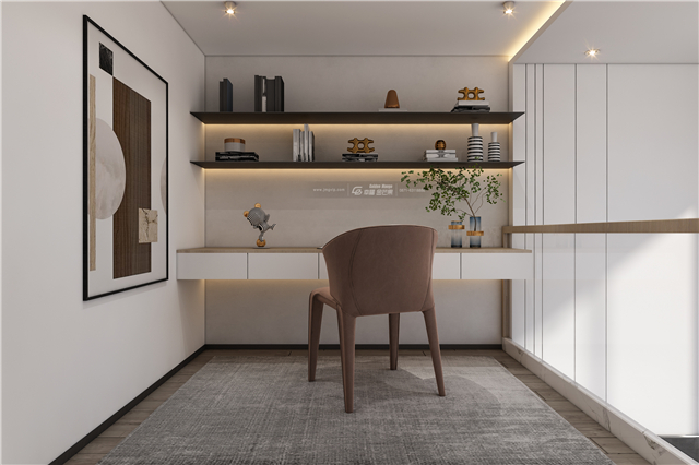 透明的玻璃扶手,簡約的設計開辟出一塊閱讀休閑的小天地,溫馨又甜美的配色讓書房空間變得溫暖而精致。