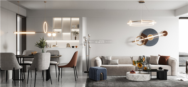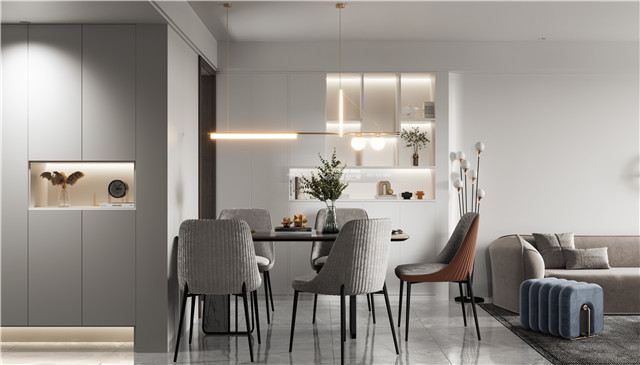 干凈純粹的餐邊柜在燈光的映照下更顯溫暖,用餐變得溫馨而放松。