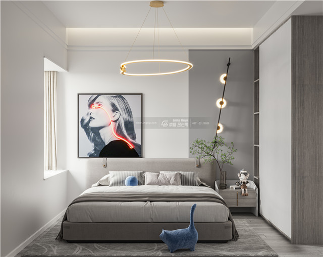 沉靜的灰色營造適合舒睡的適意氛圍,一幅生動的裝飾畫將空間變得活潑起來,個性的燈飾讓空間格調(diào)變得時尚而個性。