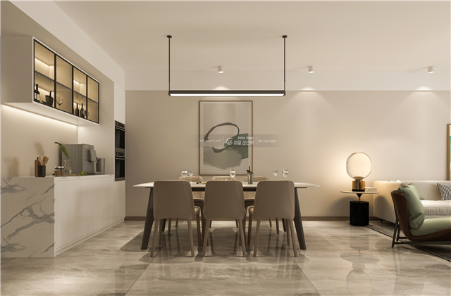 細膩溫柔的空間,家居氛圍也變得曖昧而生動起來。精致的餐邊柜以玻璃和黑色邊框作為點綴,大理石臺面提升空間的高級格調感。
