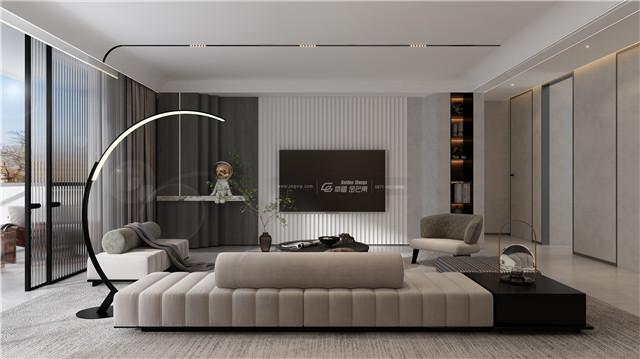 無主燈設計將空間氛圍感進一步提升,灰色帶來的沉靜感仿佛讓空間有了更多沉思的不受外界干擾的自由氣息。電視背景墻格柵處理提升空間層次感。一盞落地燈,跟營造了一些寫意氣息。