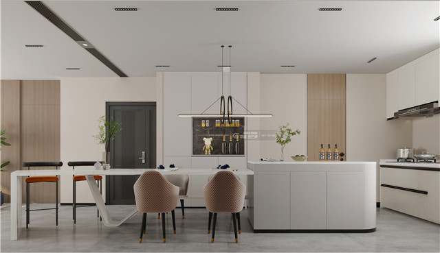將餐桌和吧臺結合在一起,空間更具造型感。中間設置島臺,同時滿足中西廚烹飪需求。精致的大理石臺面提升空間氣質感,在清爽簡潔的氛圍下更顯干凈利落。