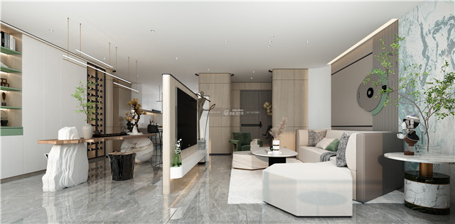 采用當(dāng)下流行的無主燈設(shè)計(jì),更符合屋主的家居定位,氛圍感更佳。沙發(fā)背景墻設(shè)計(jì)弧度,圍坐感鋪陳出溫馨的家居格調(diào)。綠色大理石清朗俊逸,十分吸睛,呼應(yīng)綠色飾品和絨布單椅,清朗與高貴的氣息巧妙融合了起來。