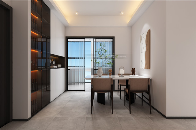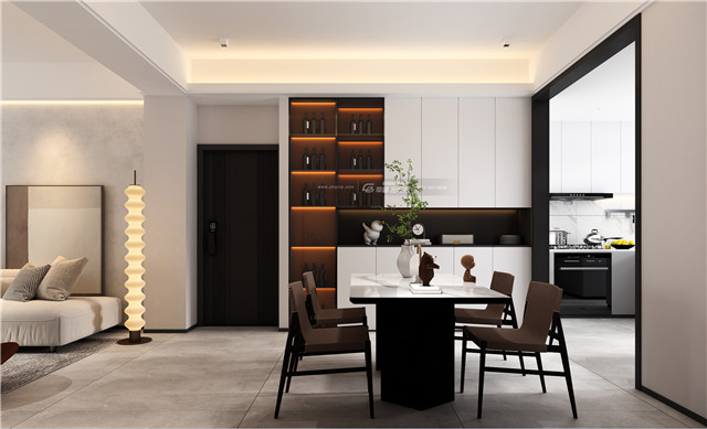 餐廳延續整體簡約的風格,餐邊柜在柜體的燈光的作用下營造低調而華麗的空間感受,為餐廳營造格調氛圍,同時也增加收納大量收納功能。餐桌椅選用的也是簡單的款式。