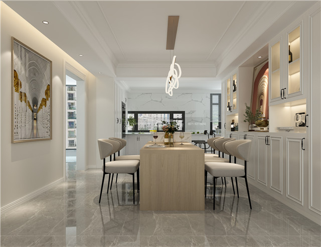 以象牙白為基調,整體奢華而充滿儀式感,營造儀式感滿滿的用餐空間。奢華的造型,精致的餐具,中西廚結合的餐廚空間,盡情展現大宅氣度,彰顯貴族般的質感生活。