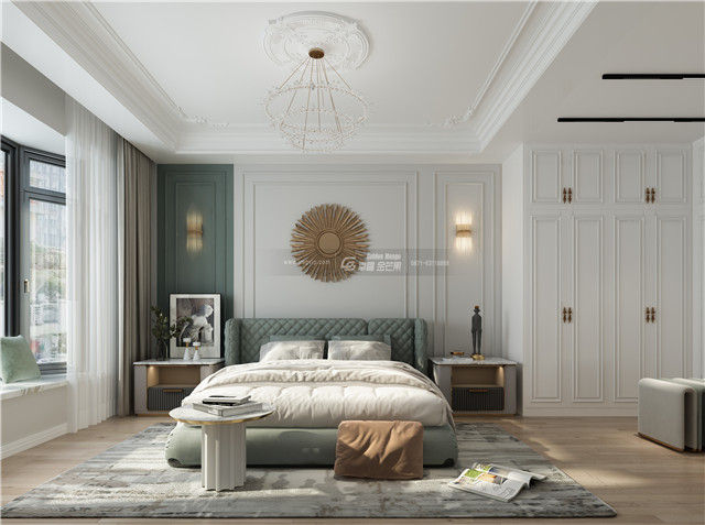 擁有貴族般的至高待遇,舉手投足都變得優雅起來。吊頂上的雕花設計,優雅而不失高貴的墨綠色搭配,華麗的斗柜,品質感滿溢的木地板,處處可見用心,華貴的氣質下,藏不住的格調生活,蔓延全屋的歐式浪漫情調。