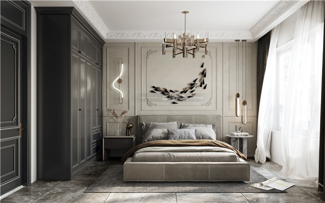 高級暗黑色的神秘優雅氣息,展現氣質優雅的適合舒睡的就寢空間。床頭背景精美的裝飾,將空間格調拉滿,靜謐又溫柔,又甜又颯,韻味十足。
