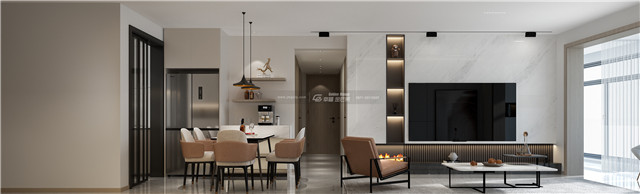 摒棄繁雜的電視柜,厚重的茶幾,生活化繁為簡。大理石電視背景墻,因為木質柜體和暖光源的加入變得愈加有質感?;蛳萑肷嘲l,或坐臥地毯,房屋本身散發的安逸感,足以在匆忙的歲月中,給予心靈最溫柔的撫慰。