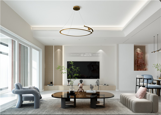 簡約的電視背景墻搭配木質格柵,嗅一口仿佛有木頭的香氣。幾株綠植肆意綻放著生命的姿態,空間也活了起來。
