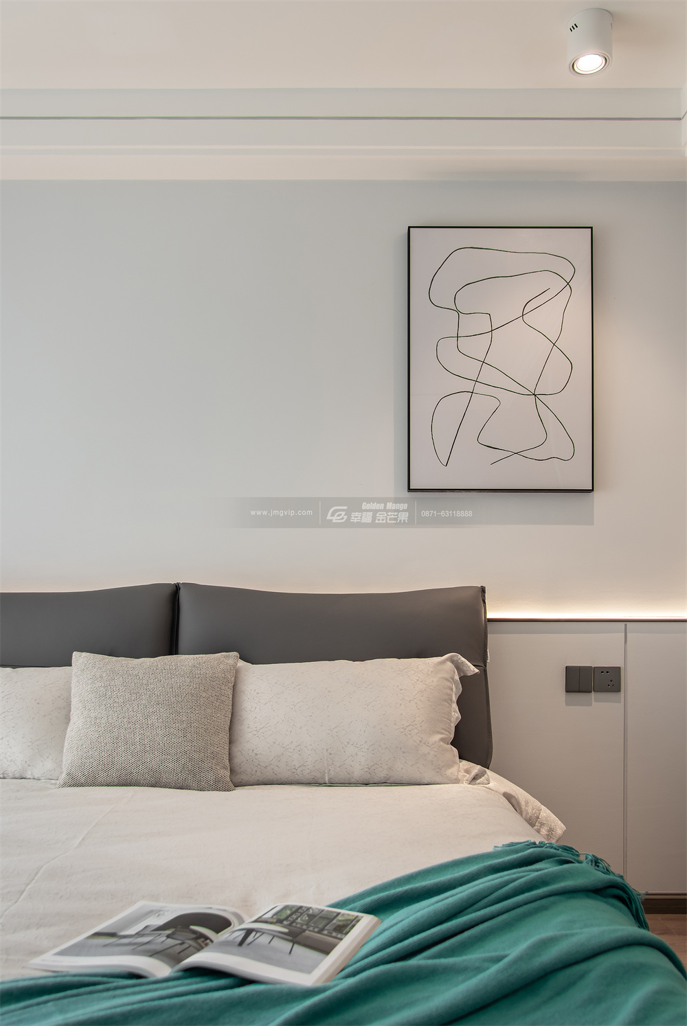主臥以灰白為主,沒有過多的裝飾,純色乳膠漆墻面+無主燈設計,放大空間視覺感。