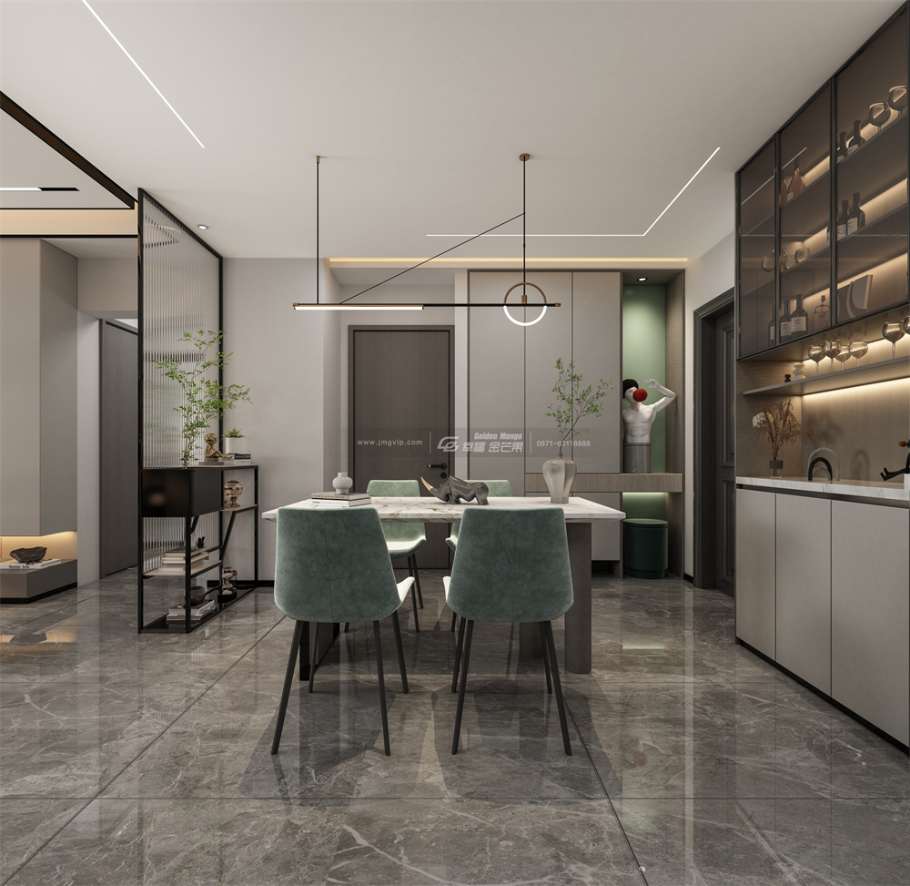 豆綠色椅子和餐廳中的綠植,避免了過于冷淡的與硬朗的視覺呈現(xiàn),賦予空間一些自然和清新。