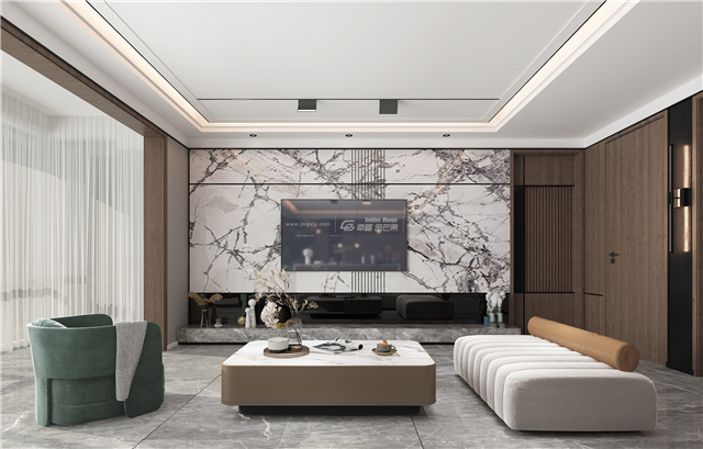 大理石電視背景墻,華麗的花紋暗藏一種低調的奢華。寬大的大落地窗,潔白的窗簾將光線引入室內,清透的格調加上華麗的家具,空間變得明媚動人。