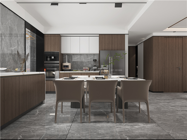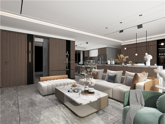 整體冷靜、安靜自在的氣質,井然有序的空間節奏,撫平煩躁的心緒,心思也變得有條理了起來。采用灰色地磚和大面積木飾面設計,空間變得沉靜而富有文藝高級的氣質。簡約的線條設計,加上大理石的點綴,絲絨材質的抱枕,整體空間奢華而沉靜內斂。