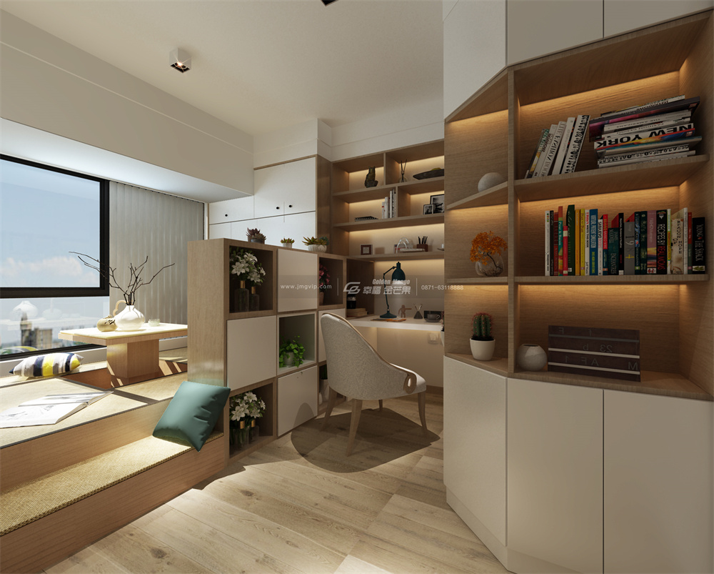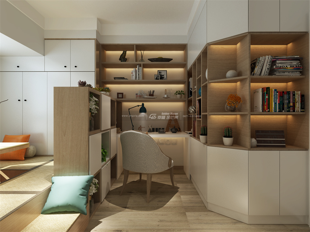 書房的設計是陽臺榻榻米與閱讀區的結合,閱讀區既可以學習、閱讀、辦公,專屬定制的柜體還可以滿足收納需求。