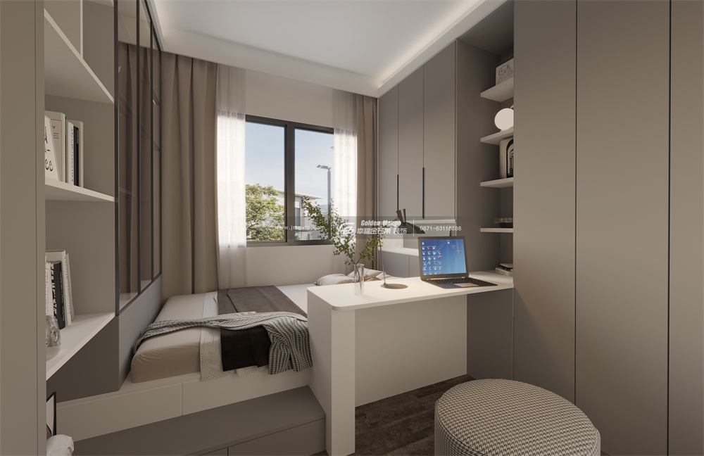 書(shū)房色調(diào)偏沉穩(wěn),辦公桌正對(duì)窗臺(tái),視野開(kāi)闊,辦公之余也能放松眼睛;榻榻米的設(shè)計(jì)使書(shū)房兼具客臥的功能,也可以當(dāng)做午后小憩的地方,空間得到最大化利用。