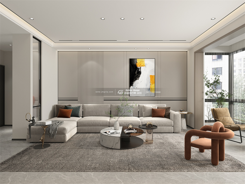 客廳空間色調柔和簡約,沒有過多的裝飾,用極簡柔軟的方塊沙發搭配圓形大理石茶幾,無主燈設計加上內嵌式燈帶處理,點綴少許綠植,寧靜溫柔有質感的空間,時尚美感爆棚!