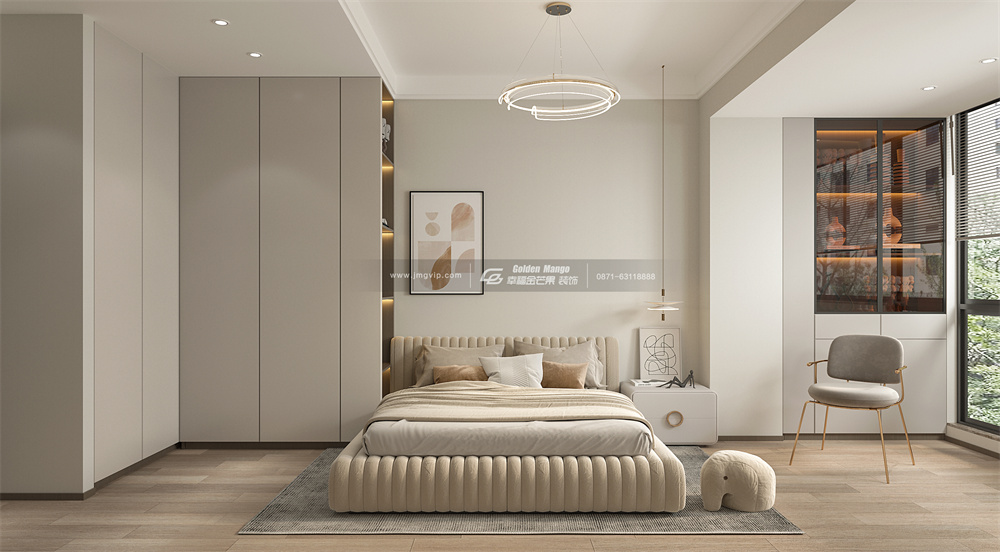 臥室空間整體色調以暖色調為主,柔軟舒適;衣柜采用一門到頂柜