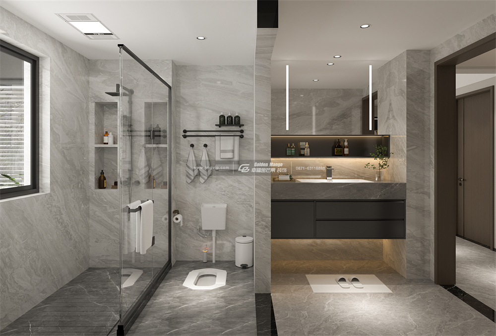 衛生間干濕分離,各功能分區各占一角,平分春色,地面選擇灰色大理石瓷磚整體鋪貼,墻磚選用灰白色大理石瓷磚整體通鋪,整體以灰白色調為主,質感直接拉滿。