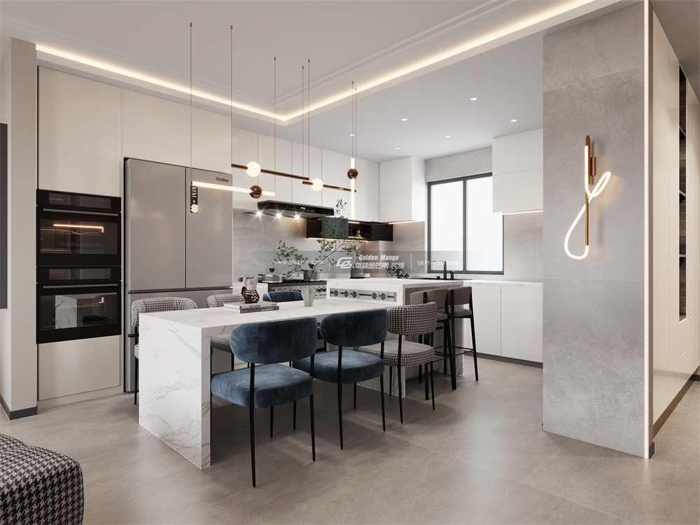 高級灰搭配線形吊燈和內嵌式燈帶設計,設計感滿滿的同時簡約又大氣;就餐區和中島吧臺合二為一、高低臺一體裝修設計,方便又實用。